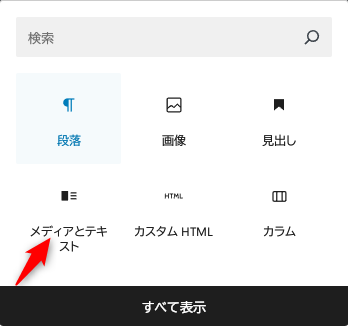 ブロックを追加をクリックして、メディアとテキストをクリックします。