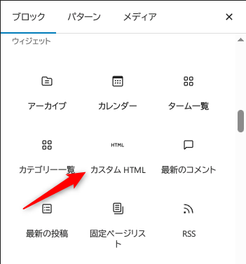 ブロックからカスタムHTMLを選択。