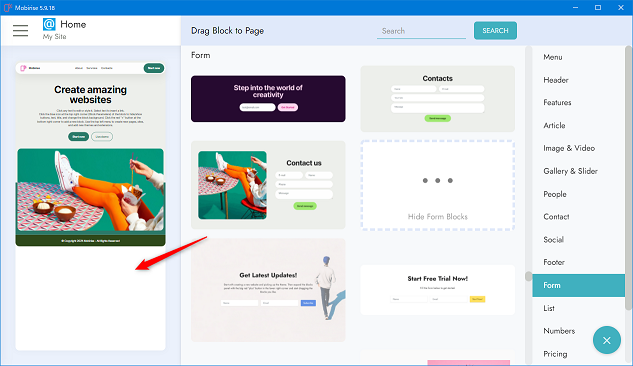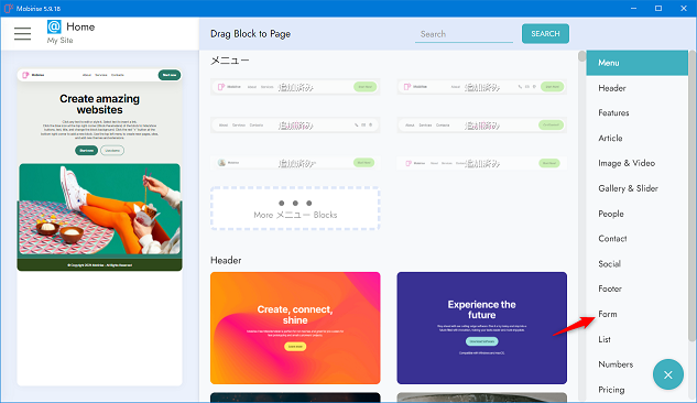 まずはMobirise(モビライズ)を起動し、Formを選択します。